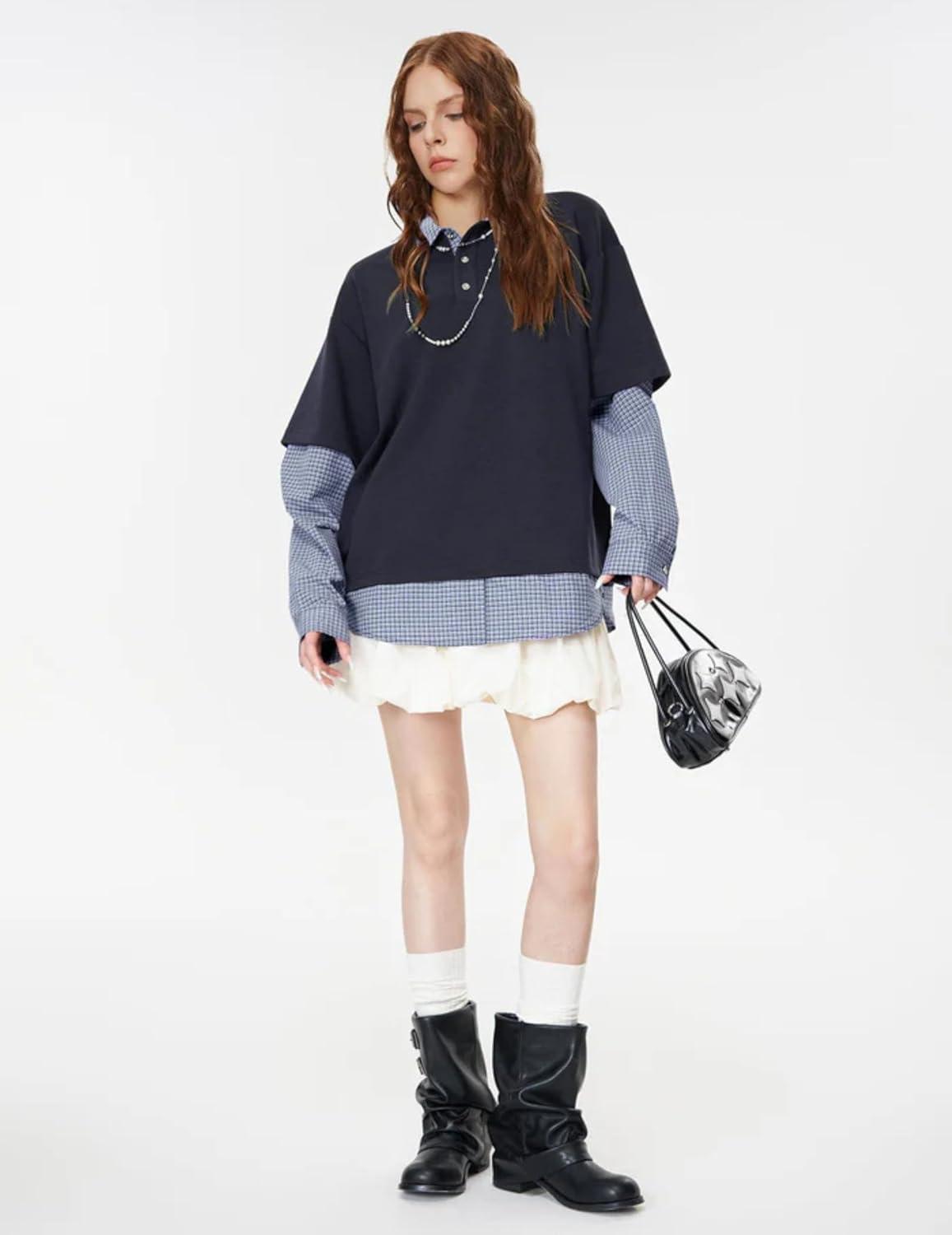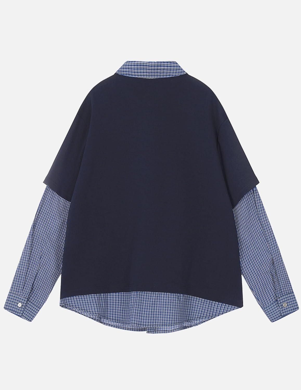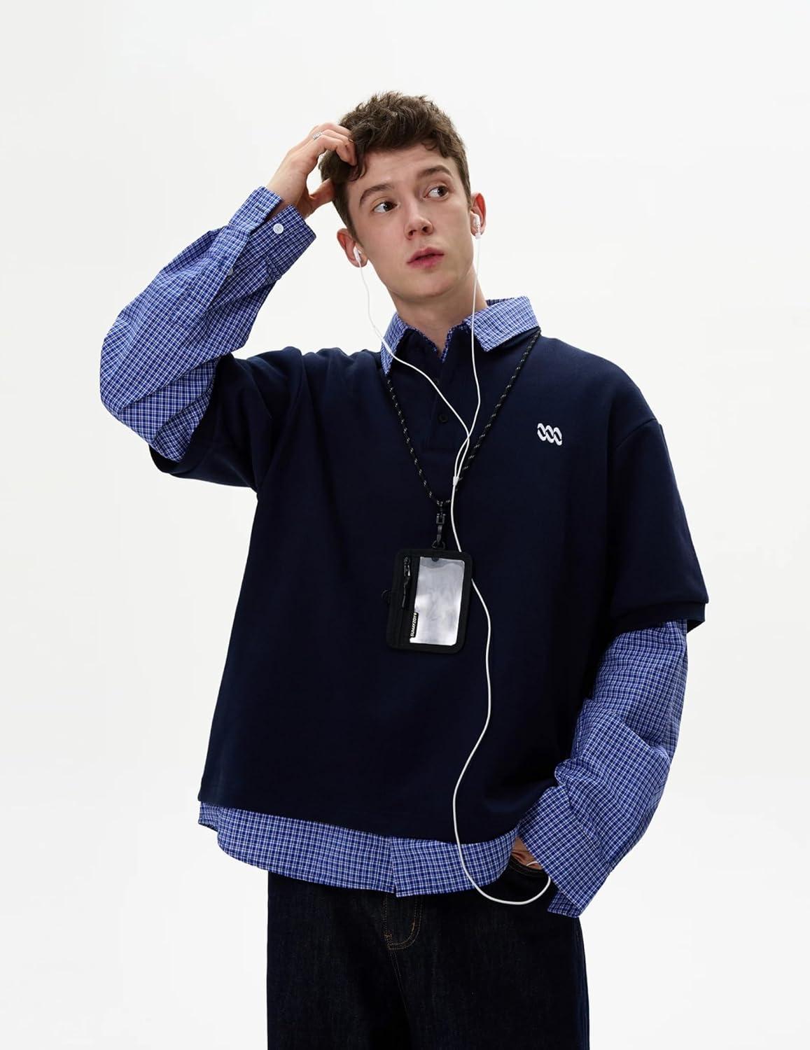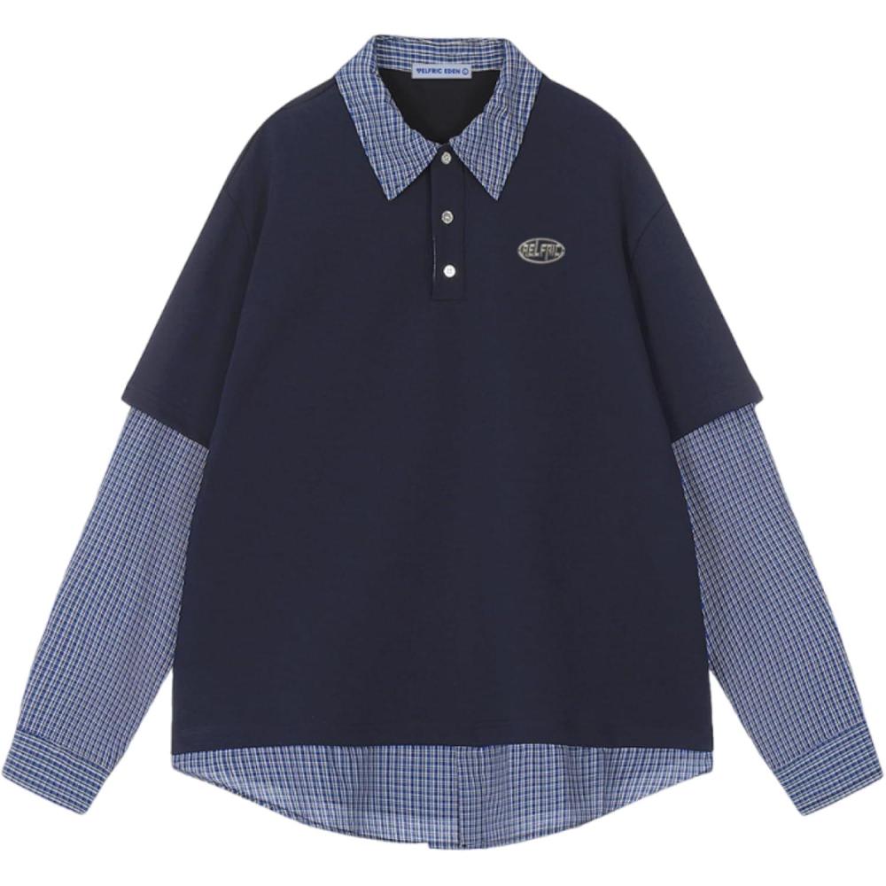 Aelfric Eden Shirts Double Layer Polo Long Sleeve Tee Oversized Casual Y2k Tops(Blue)