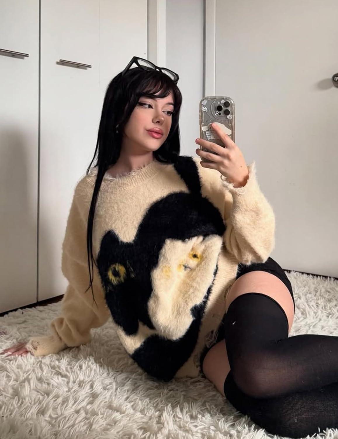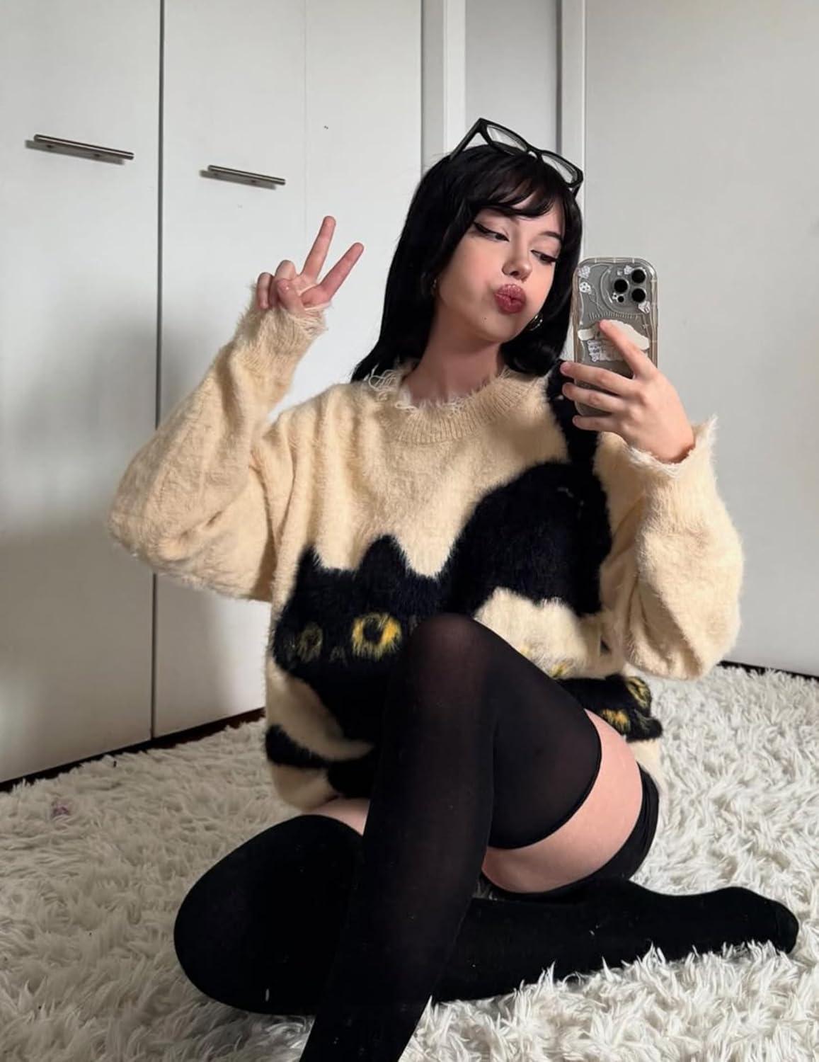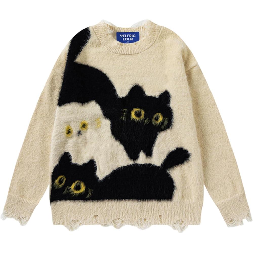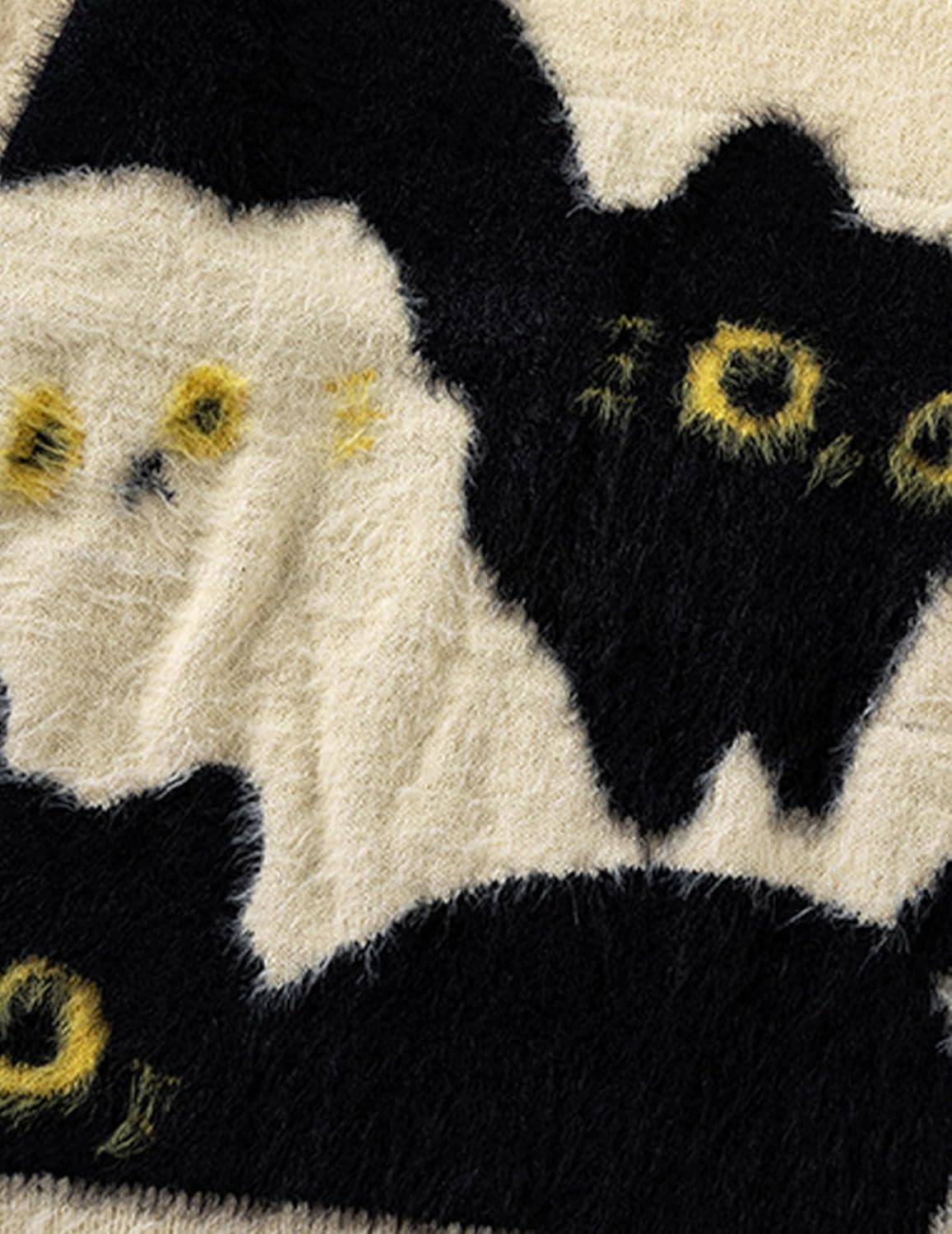Aelfric Eden Women’s Pullover Sweater Color Blocking Cat Graphic Sweater Casual Soft Warm Fall Winter Knitted Tops(Black)