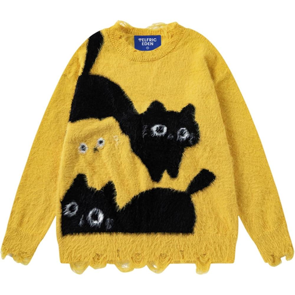 Aelfric Eden Women's Pullover Sweater Color Blocking Cat Graphic Sweater Casual Soft Warm Fall Winter Knitted Tops(Yellow)